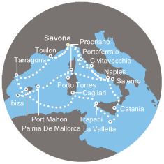 Savona (Italia) > Tolón (Francia) | Tolón (Francia) > Tarragona (España) | Tarragona (España) > Ibiza | Ibiza > Palma de Mallorca (España) | Palma de Mallorca (España) > Port Mahón (España) | Port Mahón (España) > Porto Torres (Italia) | Porto Torres (Italia) > Propriano (Córcega) | Propriano (Córcega) > Nápoles (Italia) | Nápoles (Italia) > Portoferraio (Italia) | Portoferraio (Italia) > Savona (Italia) | Savona (Italia) > Tolón (Francia) | Tolón (Francia) > Tarragona (España) | Tarragona (España) > Palma de Mallorca (España) | Palma de Mallorca (España) > Cagliari (Italia) | Cagliari (Italia) > Trapani (Italia) | Trapani (Italia) > La Valletta (Malta) | La Valletta (Malta) > Catania (Italia) | Catania (Italia) > Salerno (Italia) | Salerno (Italia) > Civitavecchia / Roma | Civitavecchia / Roma > Savona (Italia).